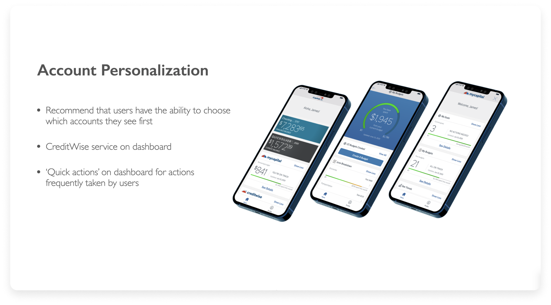 Users should be empowered to customize their dashboard by prioritizing account displays and accessing their credit score, enhancing overall usability.