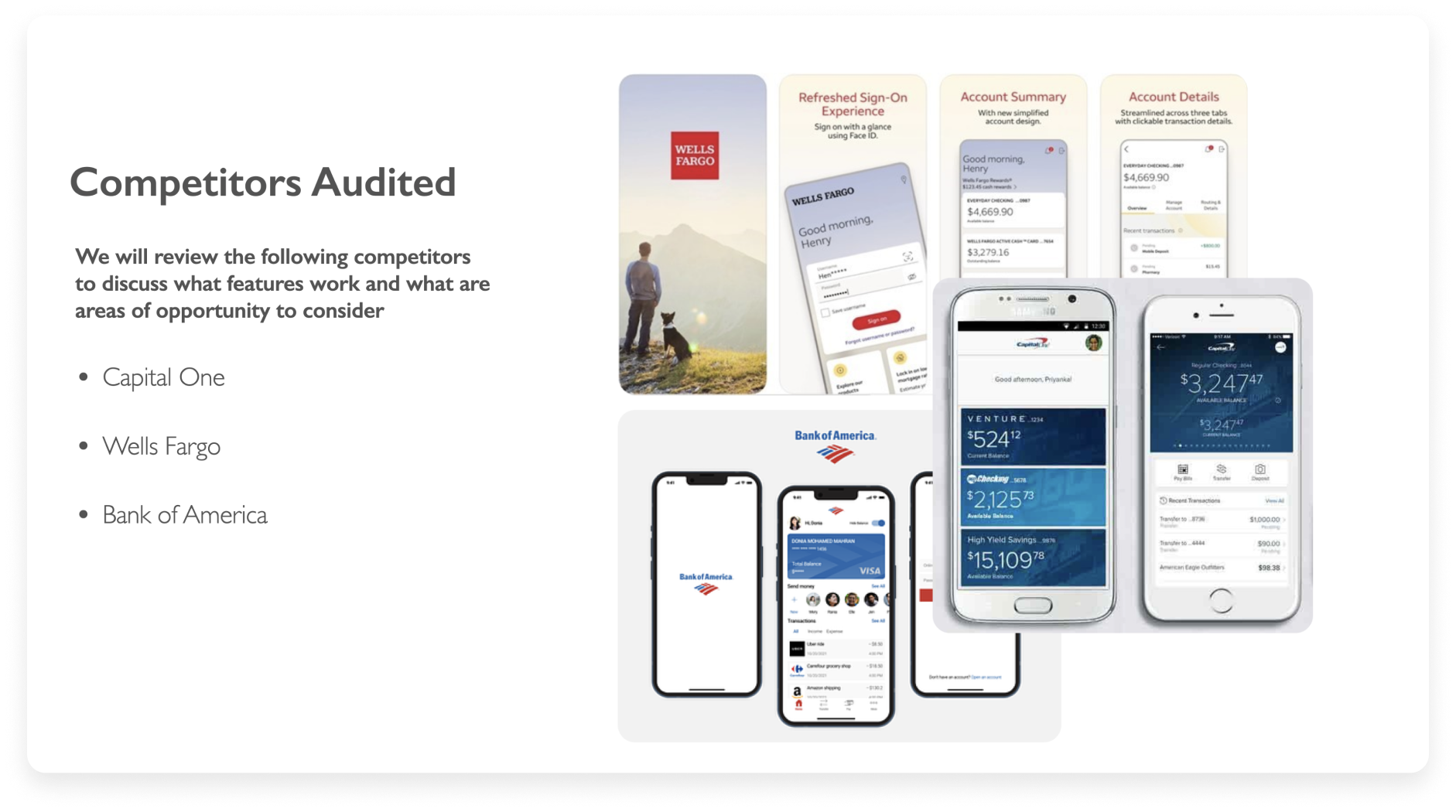 In the process of executing a competitive analysis, I explored the mobile applications of premier financial institutions, aiming to extract valuable insights and identify industry best practices. The entities scrutinized in this audit included Capital One, Wells Fargo, and Bank of America.