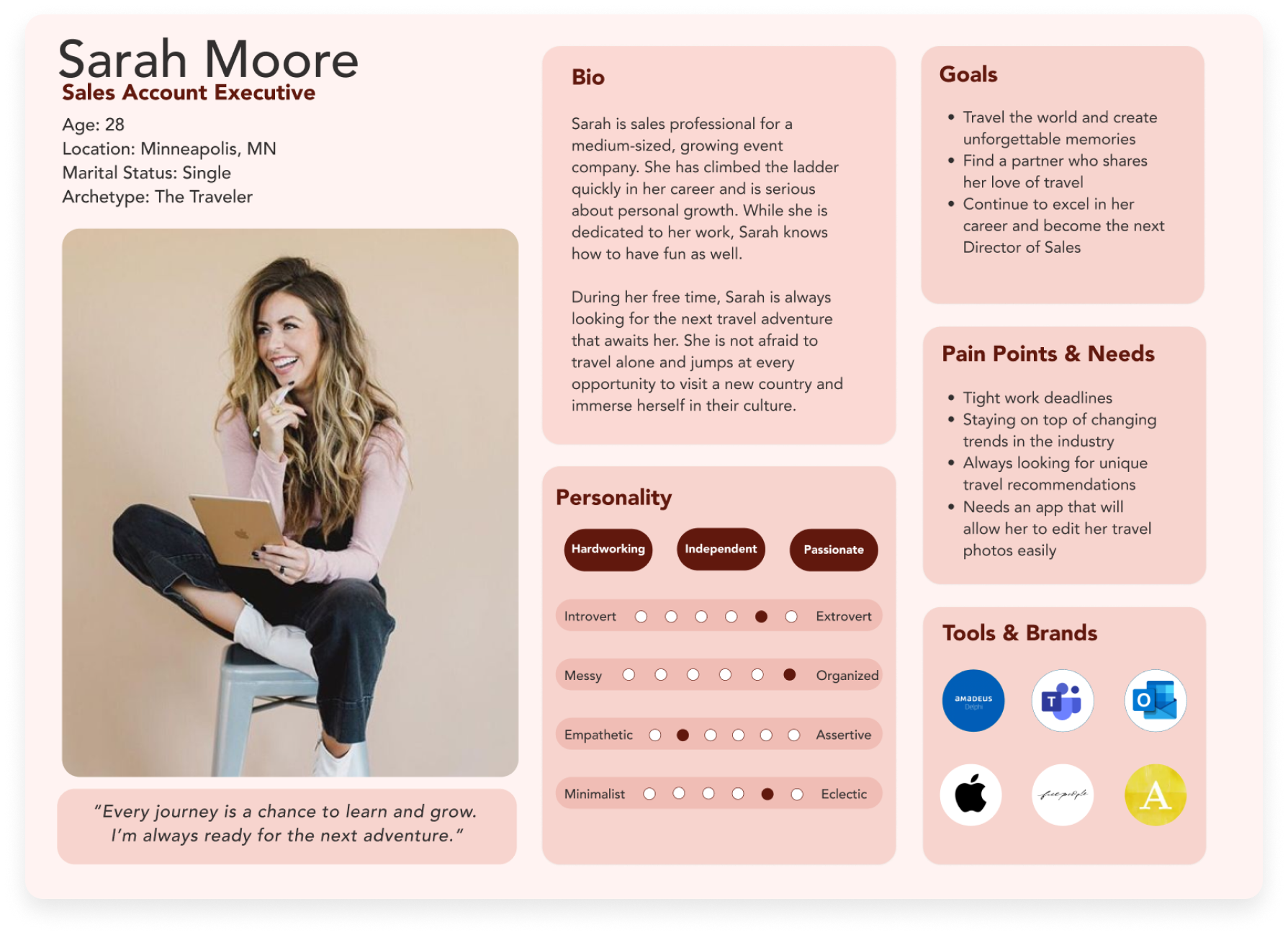 Two unique user profiles were crafted, each encompassing the diverse array of traits and actions within our desired audience. This customized strategy promotes a design process that is more personalized and empathetic, effectively aligning with the varied requirements and inclinations of our users.