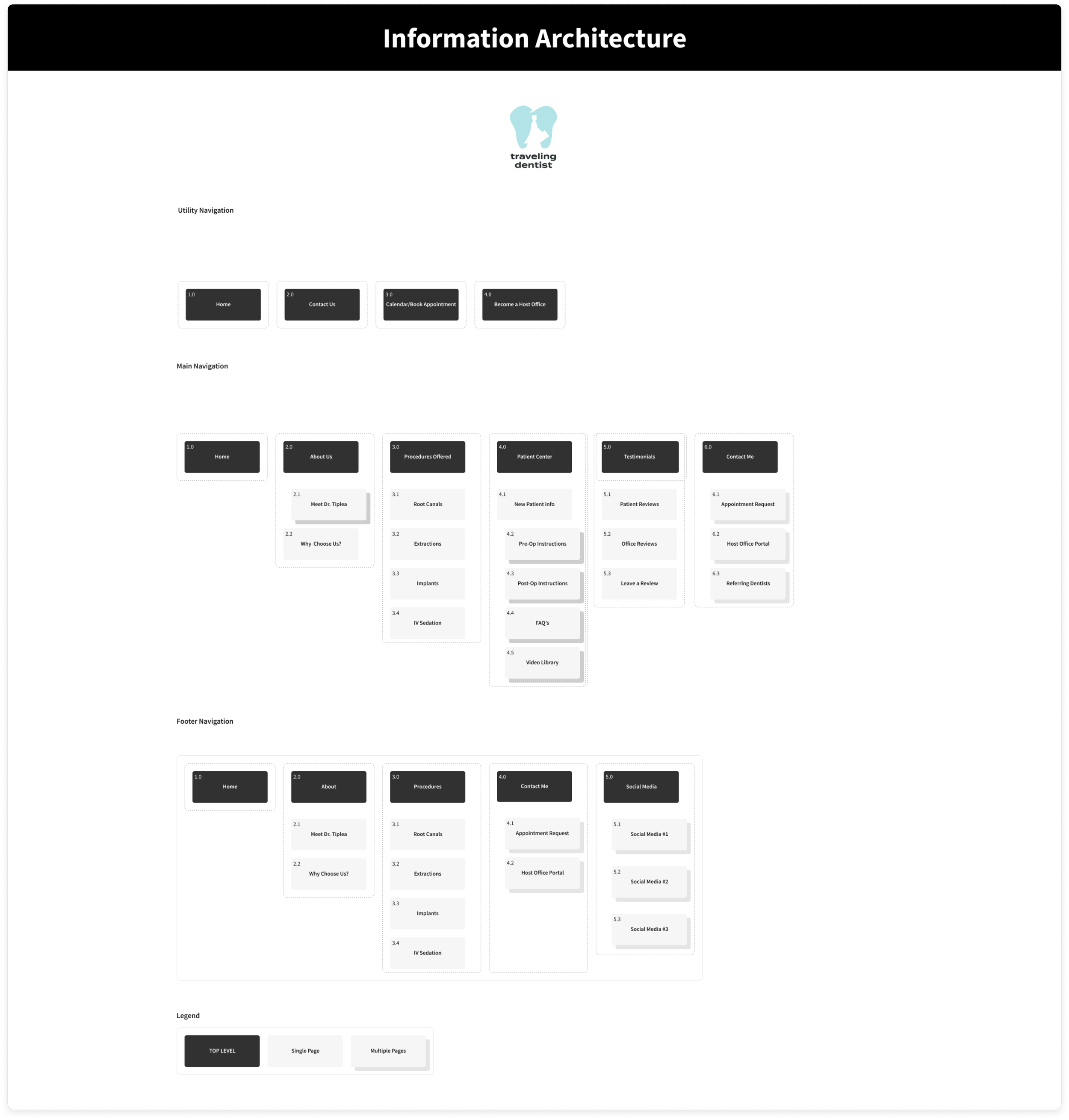 A site map for Dr. Tiplea's website was structured to prioritize intuitive navigation and streamlined access to vital information.