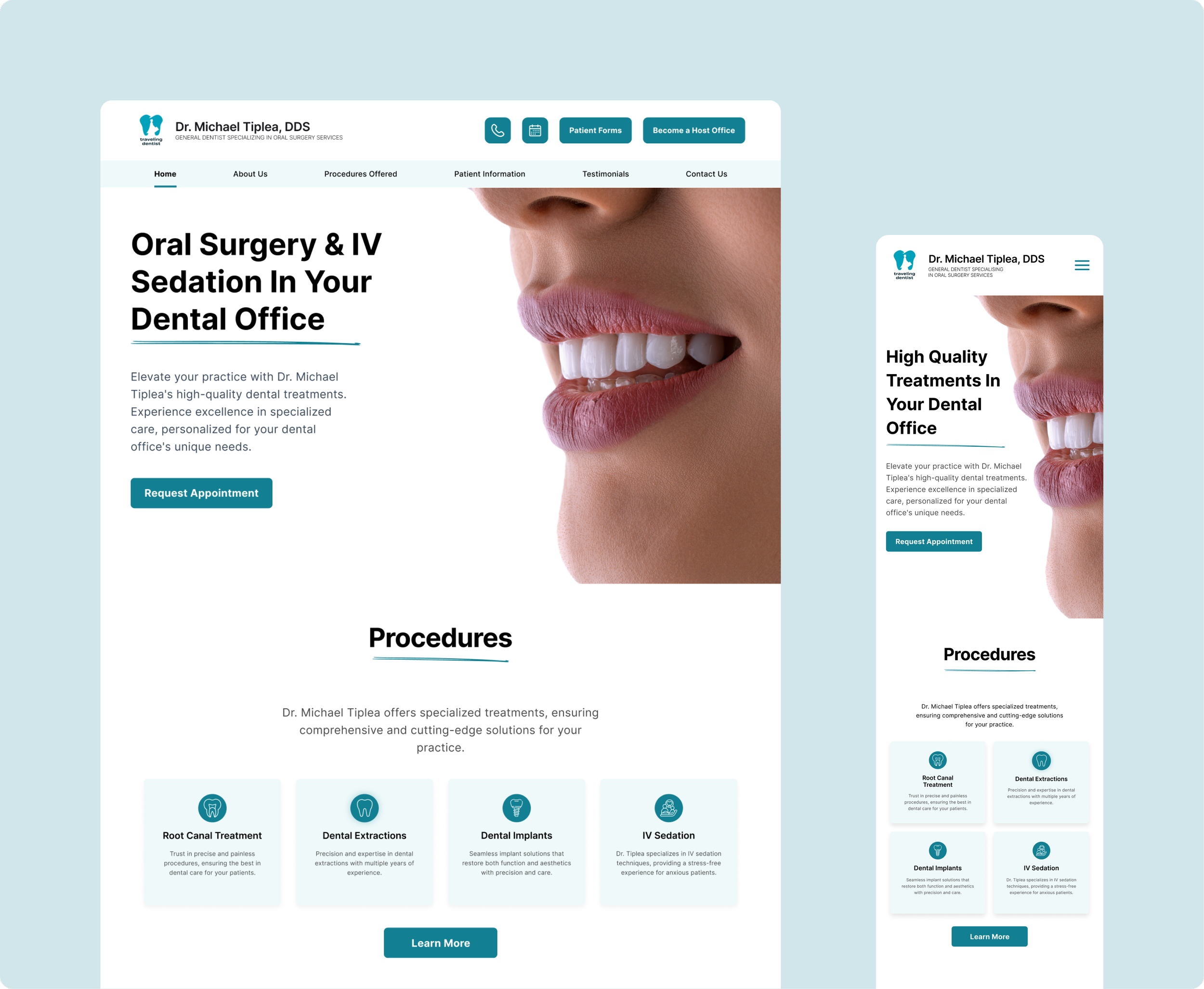 Our team embarked on a collaborative project aimed at crafting a responsive website tailored to meet the unique needs of a mobile oral surgeon specializing in oral surgery and IV sedation, with a specific focus on servicing dental offices located in the Northern Texas region.