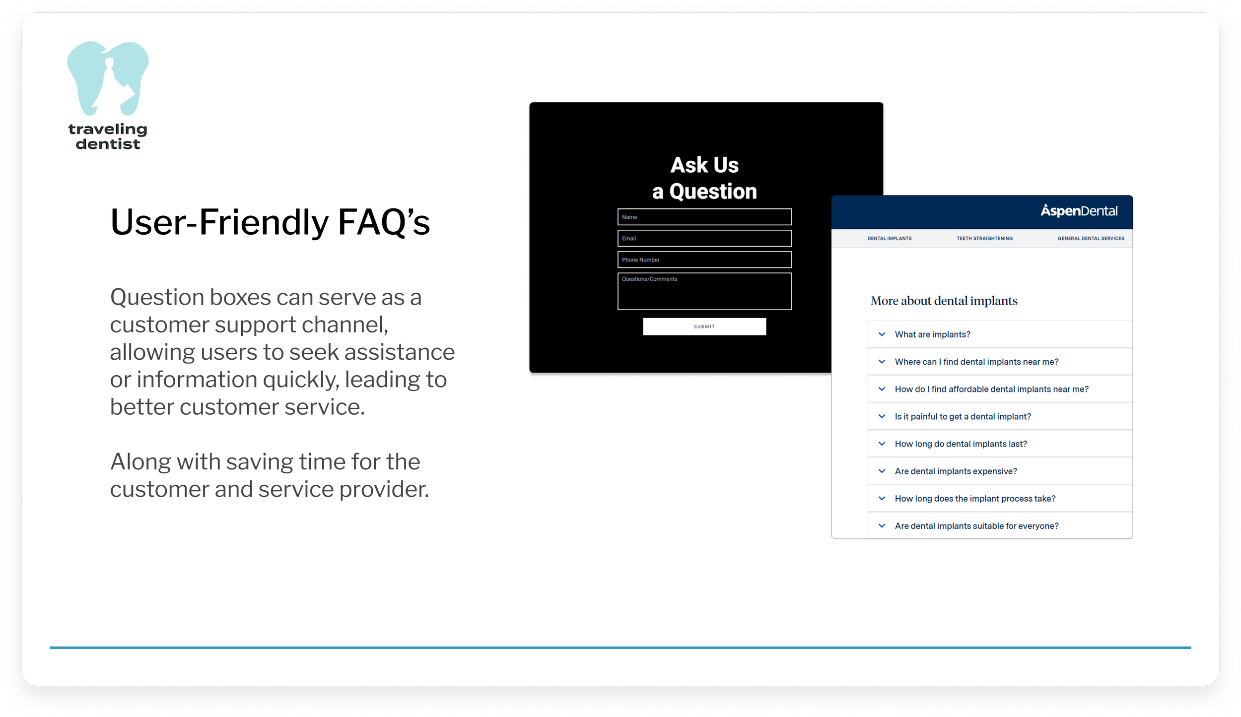 Integrating question forms and a succinct FAQ section serves as invaluable resources for users, potentially reducing the reliance on direct customer support and enhancing overall user satisfaction